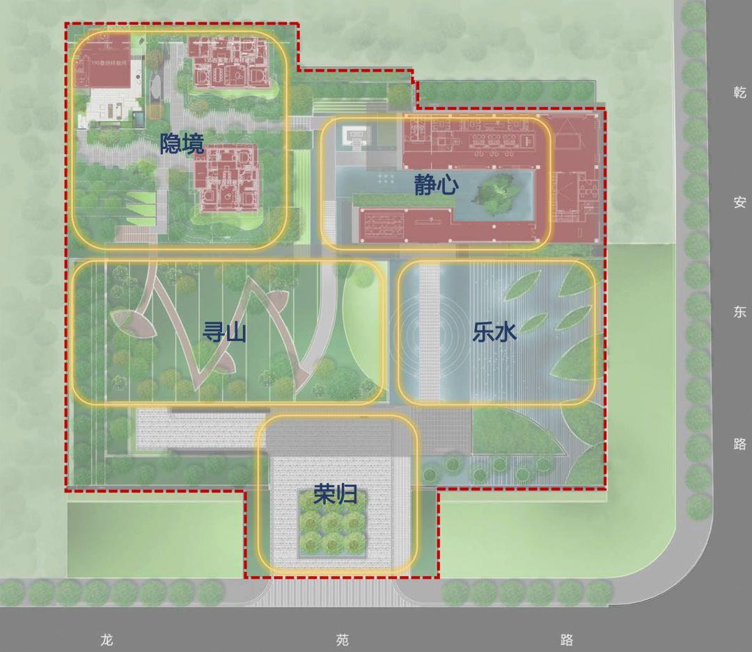 宸庐诗画园林示范区,采用景观递进和移步换景的设计手法,通过“荣归—乐水—静心—寻山—隐境”的有机动线,将王维的山水情怀贯穿其间,浓荫之下,屋脊隐现,曲径通幽,移步异景。