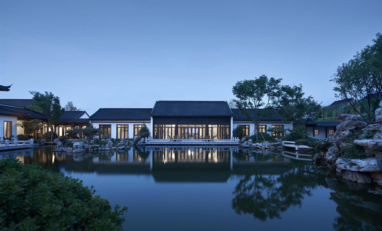 东方美学的“气韵”是缥缈且难以物化的,因此设计继承并优化了传统山院的形制,将借景、对景等传统造园手法融入项目的中式合院区,通过漏窗、月洞门、门廊等使被分隔的空间发生渗透,以形成分而不隔、穷而不尽的视觉体验。鸟瞰整个园区,如同一幅疏密相间、张弛有度的水墨丹青,缱绻地将环境纳入麾下,赋予场地轻盈的流动感与鲜活的生命力。