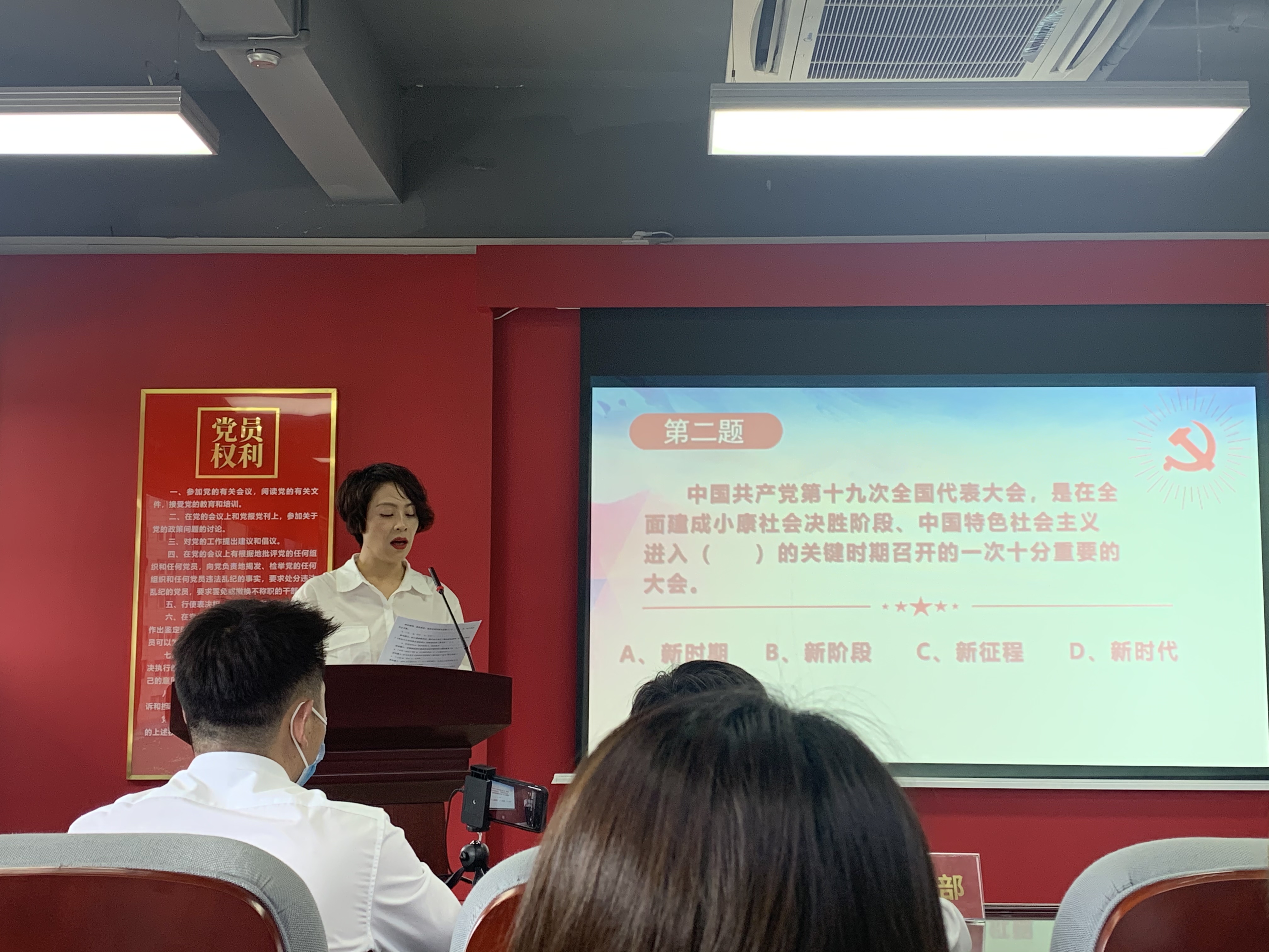 党组织书记党课学习,让大家更加深入认识到到党的进程,传承党的精神,使我们在工作中更加大放异彩。重温入党誓词,“我志愿加入中国共产党,拥护党的纲领,遵守党的章程……”坚定铿锵的誓言响彻会场,久久激荡在每一位员工心头。